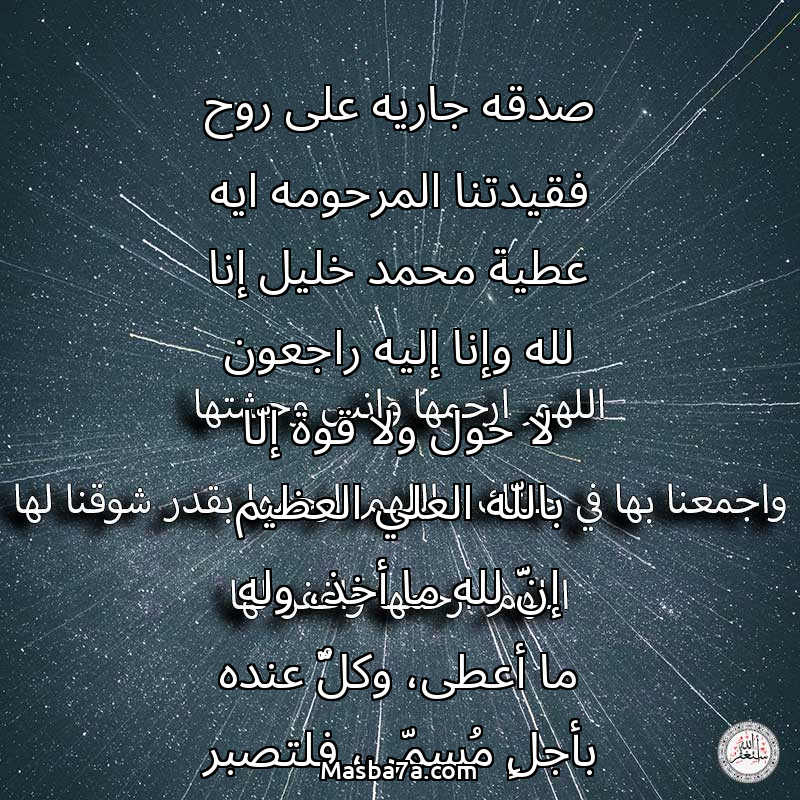 صدقه جاريه على روح فقيدتنا المرحومه ايه عطية محمد خليل إنا لله وإنا إليه راجعون لا حول ولا قوة إلّا باللّه العلي العظيم إنَّ لله ما أخذ، وله ما أعطى، وكلٌّ عنده بأجلٍ مُسمّى، فلتصبر ولتحتسب