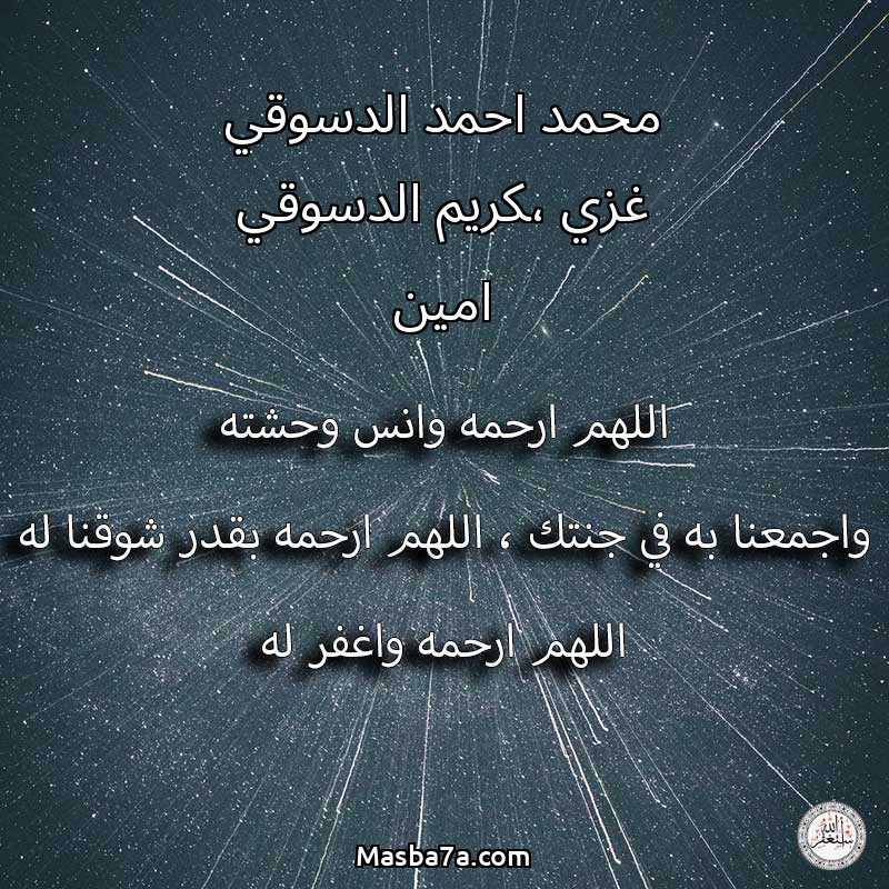 اللهم ارحم ( محمد احمد الدسوقي غزي ،كريم الدسوقي امين ) وانس وحشته واجمعنا به في جنتك ، اللهم ارحمه بقدر شوقنا له اللهم ارحمه واغفر له .