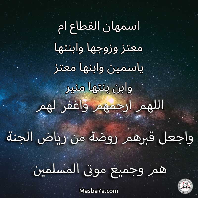 دعاء عن أرواح المرحومين اسمهان القطاع ام معتز وزوجها وابنتها ياسمين وابنها معتز وابن بنتها منير