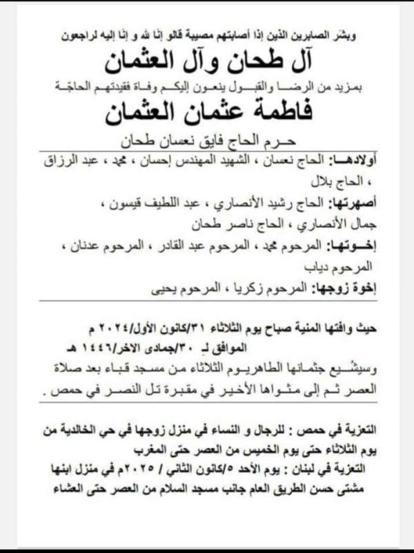 دعاء عن روح المرحومة الحاجة فاطمة عثمان العثمان
