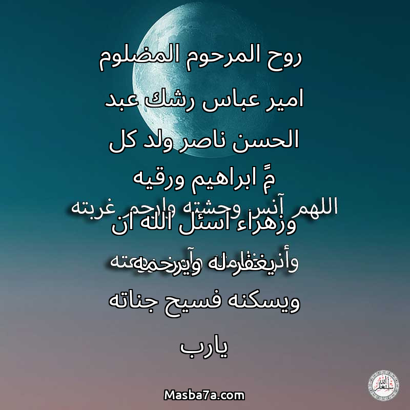 دعاء عن روح المرحوم روح المرحوم المضلوم امير عباس رشك عبد الحسن ناصر ولد كل مِہטּ ابراهيم ورقيه وزهراء اسئل الله ان يغفر له ويرحمه ويسكنه فسيح جناته يارب