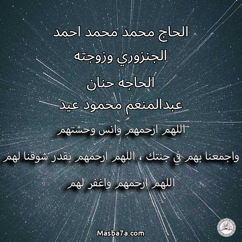 سورة الفاتحة عن أرواح الحاج محمد محمد احمد الجنزوري وزوجته الحاجه حنان عبدالمنعم محمود عيد