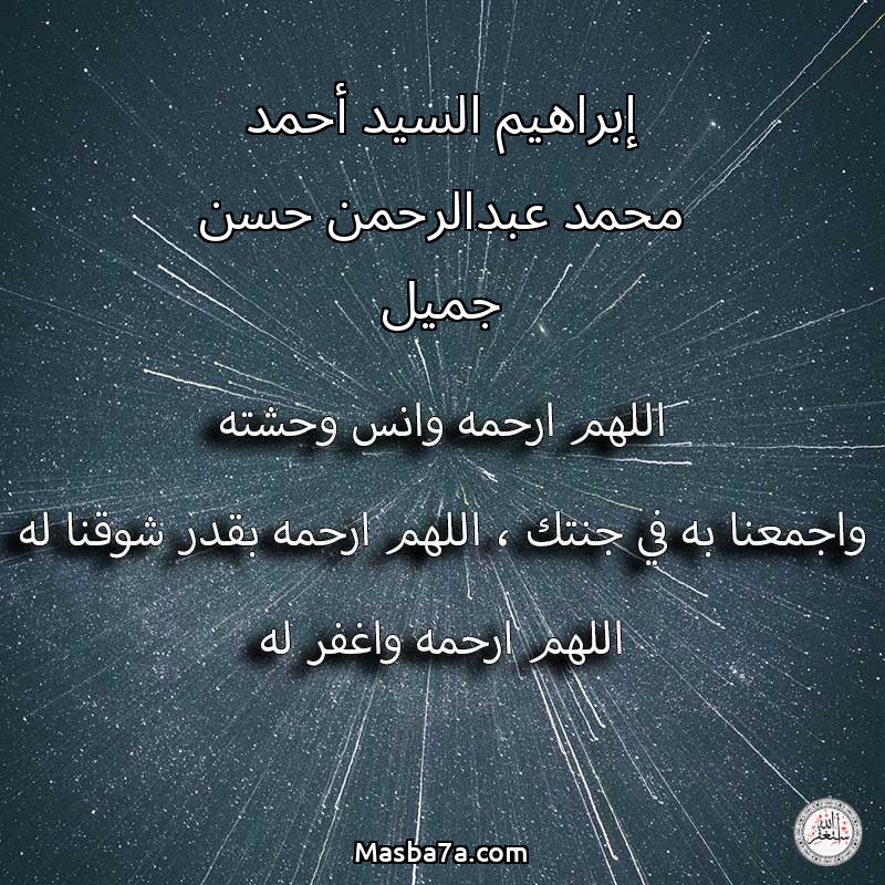 اللهم ارحم ( إبراهيم السيد أحمد محمد عبدالرحمن حسن جميل ) وانس وحشته واجمعنا به في جنتك ، اللهم ارحمه بقدر شوقنا له اللهم ارحمه واغفر له .