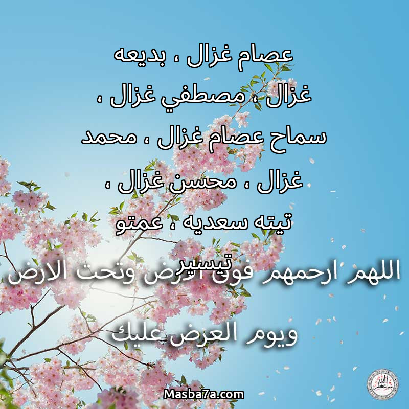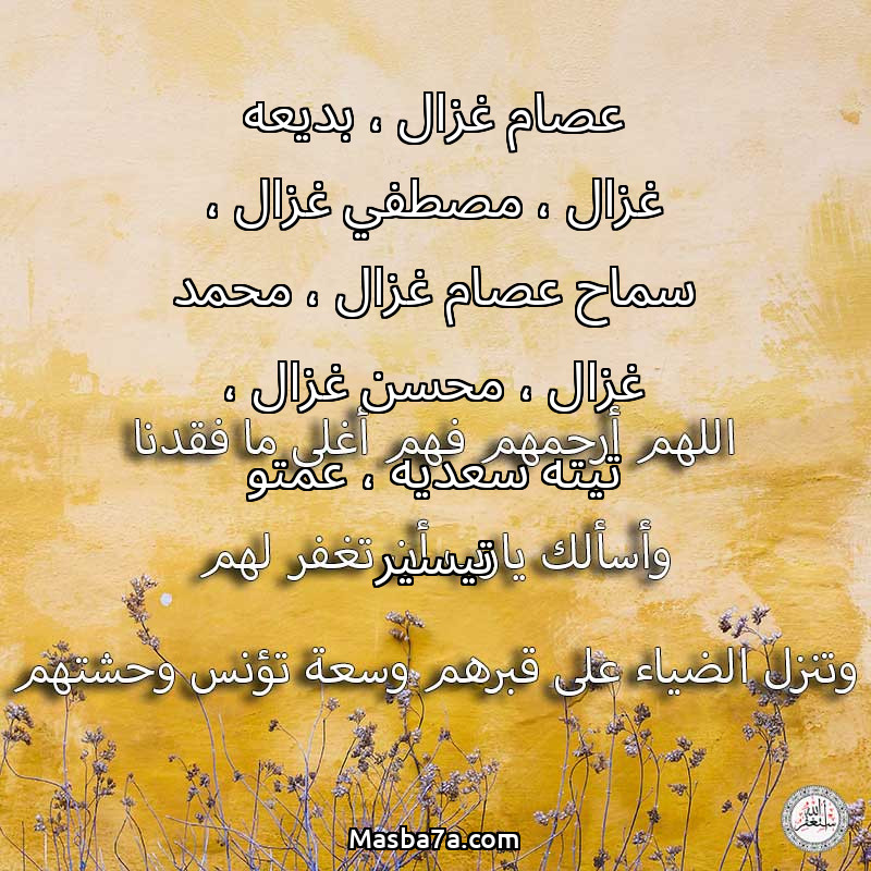 دعاء عن أرواح المرحومين عصام غزال ، بديعه غزال ، مصطفي غزال ، سماح عصام غزال ، محمد غزال ، محسن غزال ، تيته سعديه ، عمتو تيسير