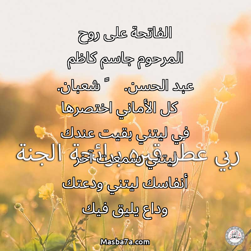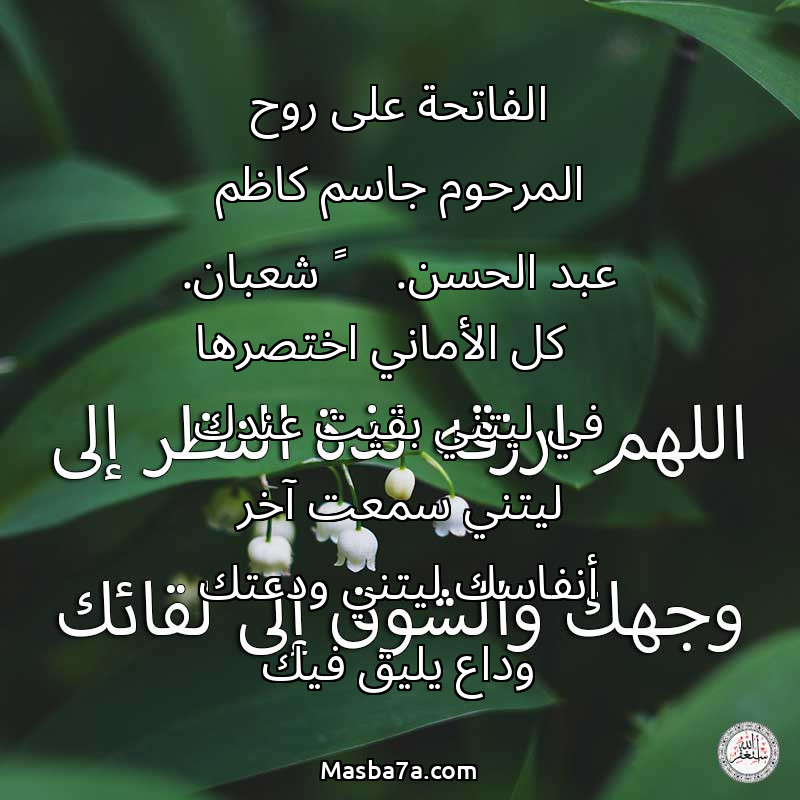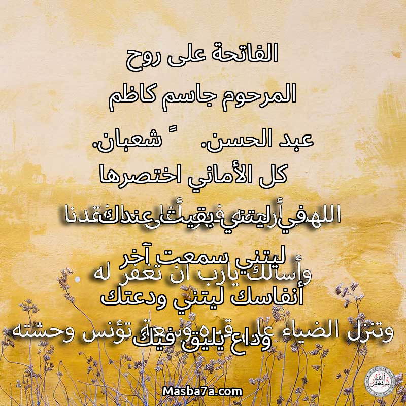 دعاء عن روح المرحوم الفاتحة على روح المرحوم جاسم كاظم عبد الحسن. ٢ شعبان. كل الأماني اختصرها في ليتني بقيت عندك ليتني سمعت آخر أنفاسك ليتني ودعتك وداع يليق فيك