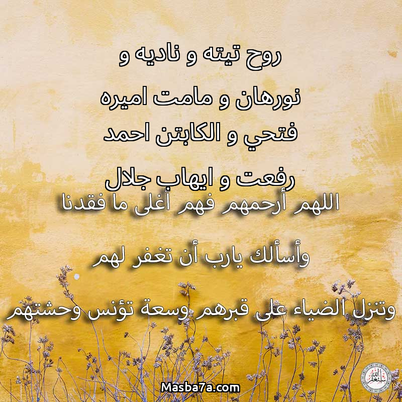 اللهم ارحم ( روح تيته و ناديه و نورهان و مامت اميره فتحي و الكابتن احمد رفعت و ايهاب جلال ) وانس وحشتهم واجمعنا بهم في جنتك ، اللهم ارحمهم بقدر شوقنا لهم اللهم ارحمهم واغفر لهم.