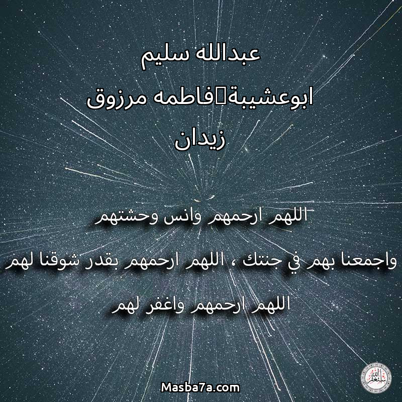 اللهم ارحم ( عبدالله سليم ابوعشيبة+فاطمه مرزوق زيدان ) وانس وحشتهم واجمعنا بهم في جنتك ، اللهم ارحمهم بقدر شوقنا لهم اللهم ارحمهم واغفر لهم.