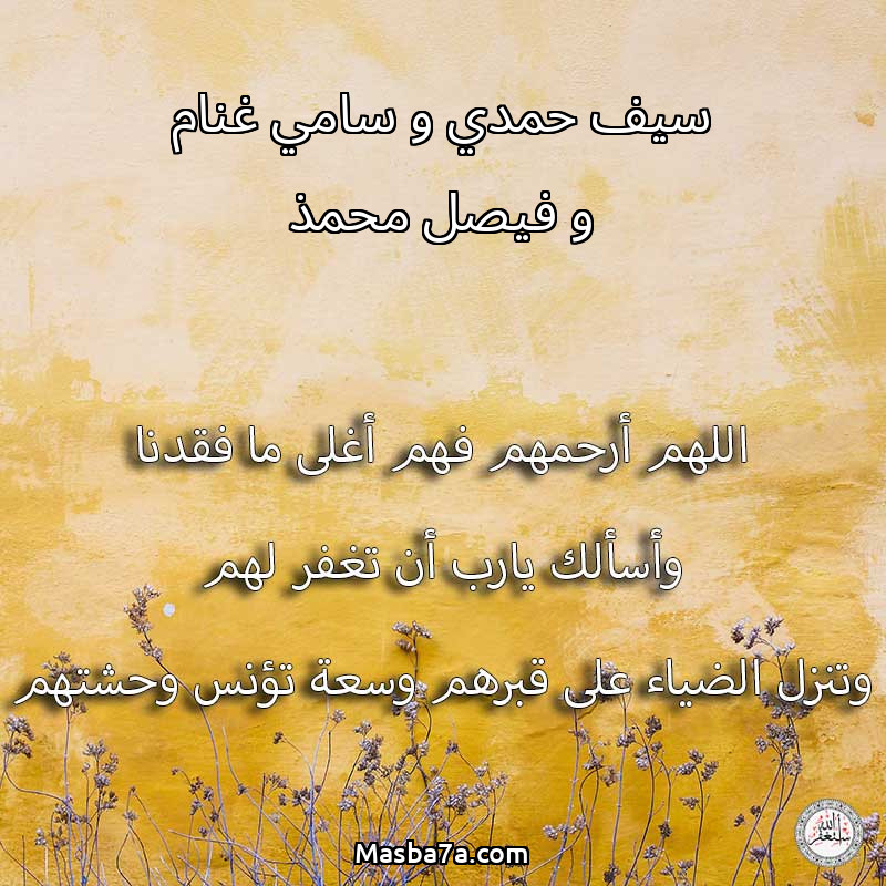 اللهم ارحم ( سيف حمدي و سامي غنام و فيصل محمذ ) وانس وحشتهم واجمعنا بهم في جنتك ، اللهم ارحمهم بقدر شوقنا لهم اللهم ارحمهم واغفر لهم.