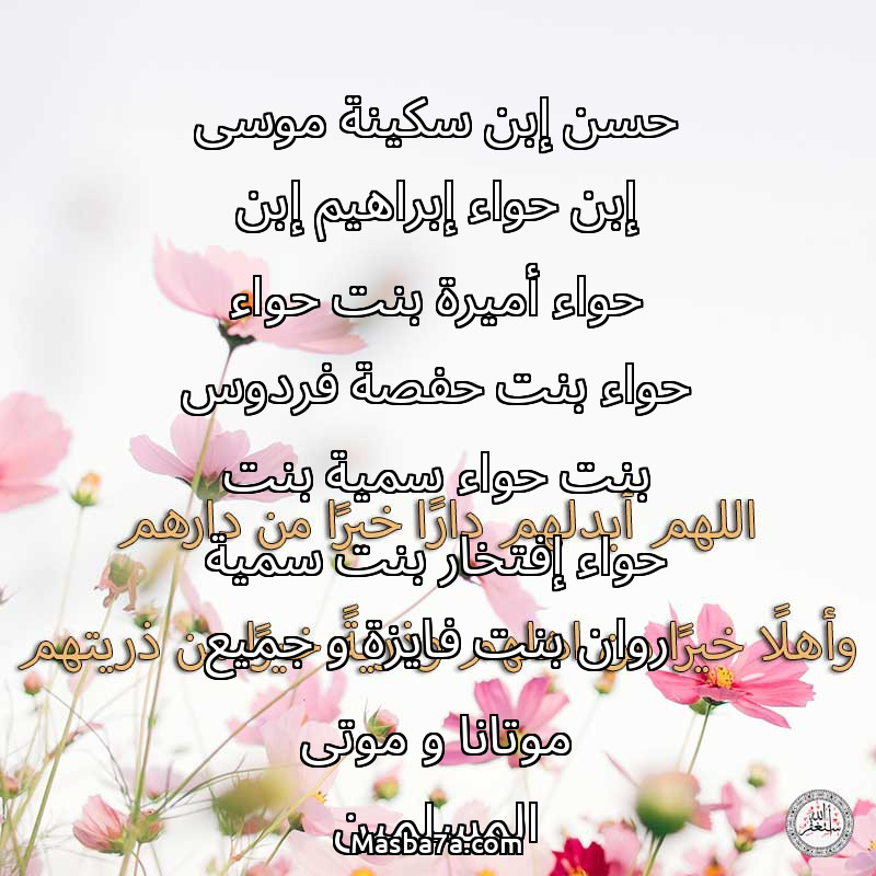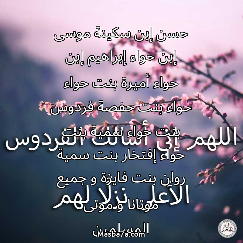 دعاء عن أرواح المرحومين حسن إبن سكينة موسى إبن حواء إبراهيم إبن حواء أميرة بنت حواء حواء بنت حفصة فردوس بنت حواء سمية بنت حواء إفتخار بنت سمية روان بنت فايزة و جميع موتانا و موتى المسلمين