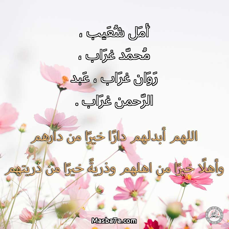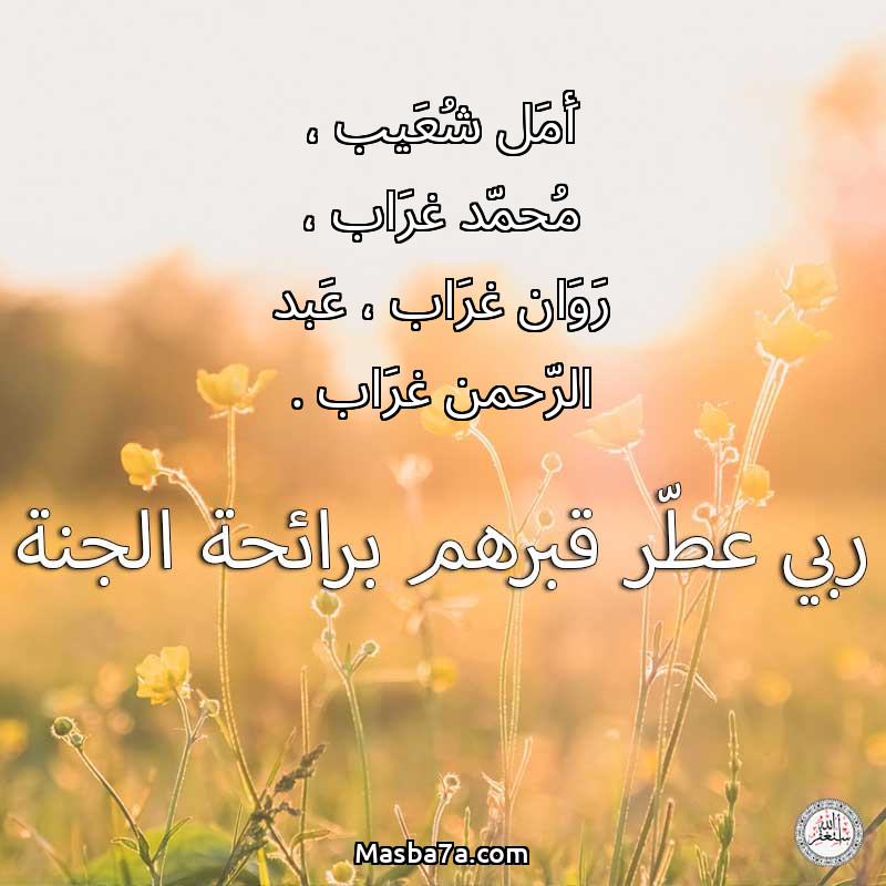 اللهم ارحم ( أَمَل شُعَيب ، مُحمّد غرَاب ، رَوَان غرَاب ، عَبد الرّحمن غرَاب . ) وانس وحشتهم واجمعنا بهم في جنتك ، اللهم ارحمهم بقدر شوقنا لهم اللهم ارحمهم واغفر لهم.