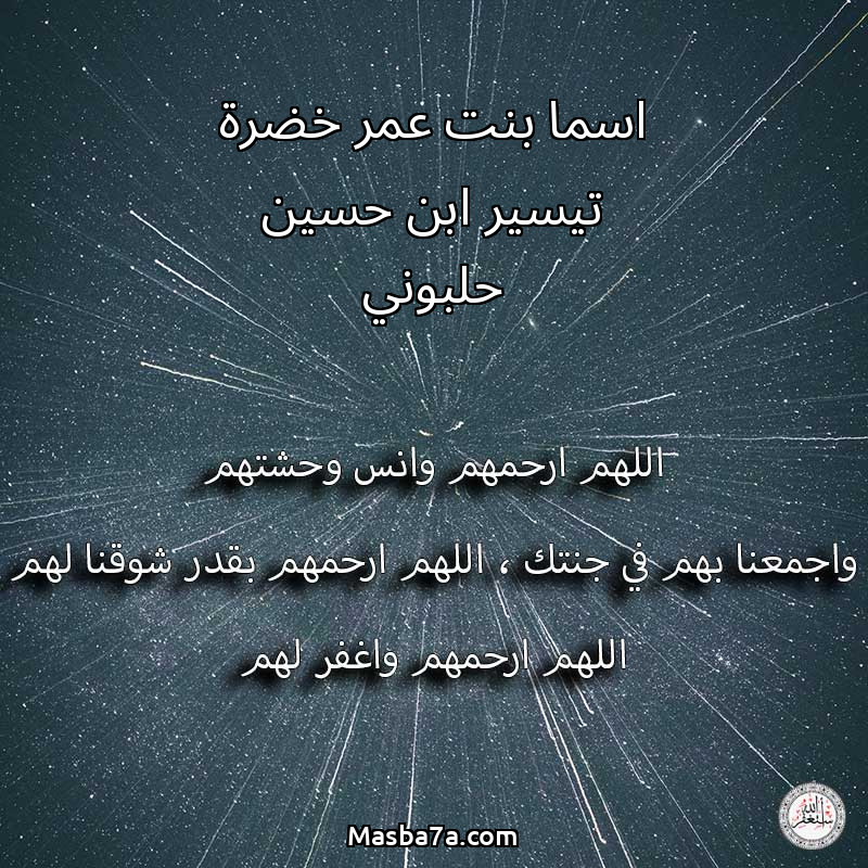 اللهم ارحم ( اسما بنت عمر خضرة تيسير ابن حسين حلبوني ) وانس وحشتهم واجمعنا بهم في جنتك ، اللهم ارحمهم بقدر شوقنا لهم اللهم ارحمهم واغفر لهم.