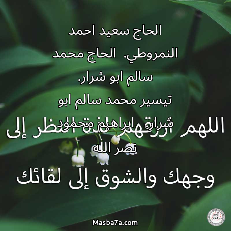 اللهم ارحم ( الحاج سعيد احمد النمروطي. الحاج محمد سالم ابو شرار. تيسير محمد سالم ابو شرار. ابراهيم محمود نصر الله ) وانس وحشتهم واجمعنا بهم في جنتك ، اللهم ارحمهم بقدر شوقنا لهم اللهم ارحمهم واغفر لهم.