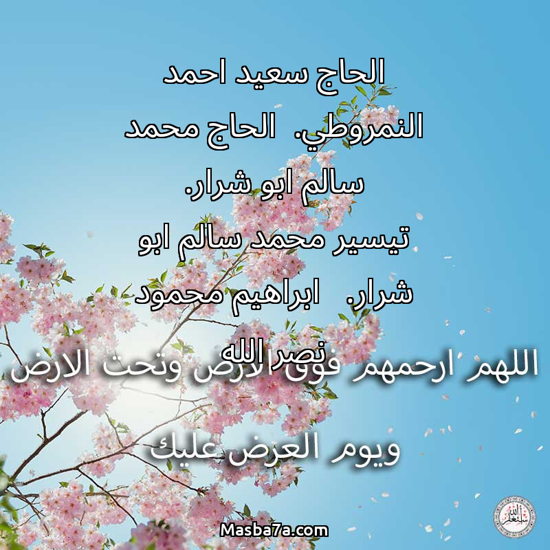 دعاء عن أرواح المرحومين الحاج سعيد احمد النمروطي. الحاج محمد سالم ابو شرار. تيسير محمد سالم ابو شرار. ابراهيم محمود نصر الله