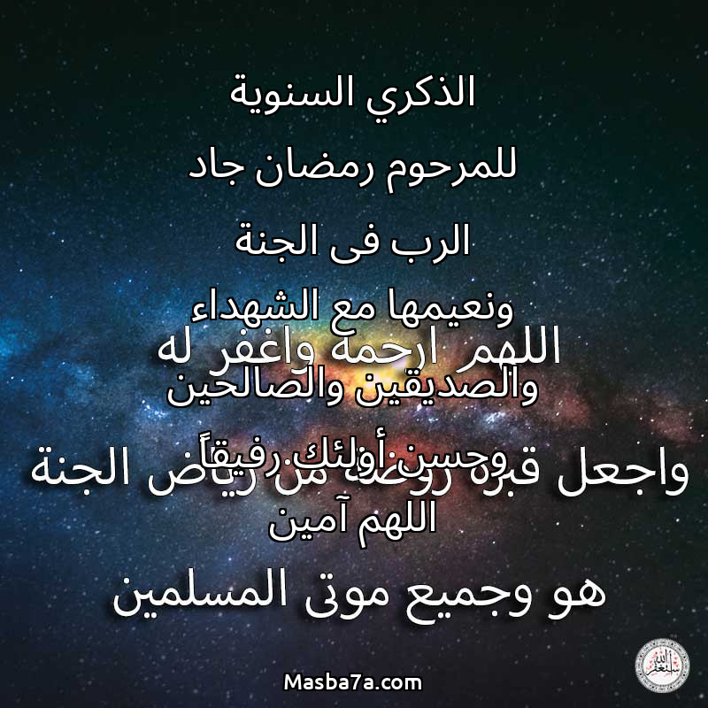 دعاء عن روح المرحوم الذكري السنوية للمرحوم رمضان جاد الرب فى الجنة ونعيمها مع الشهداء والصديقين والصالحين وحسن أولئك رفيقاً اللهم آمين