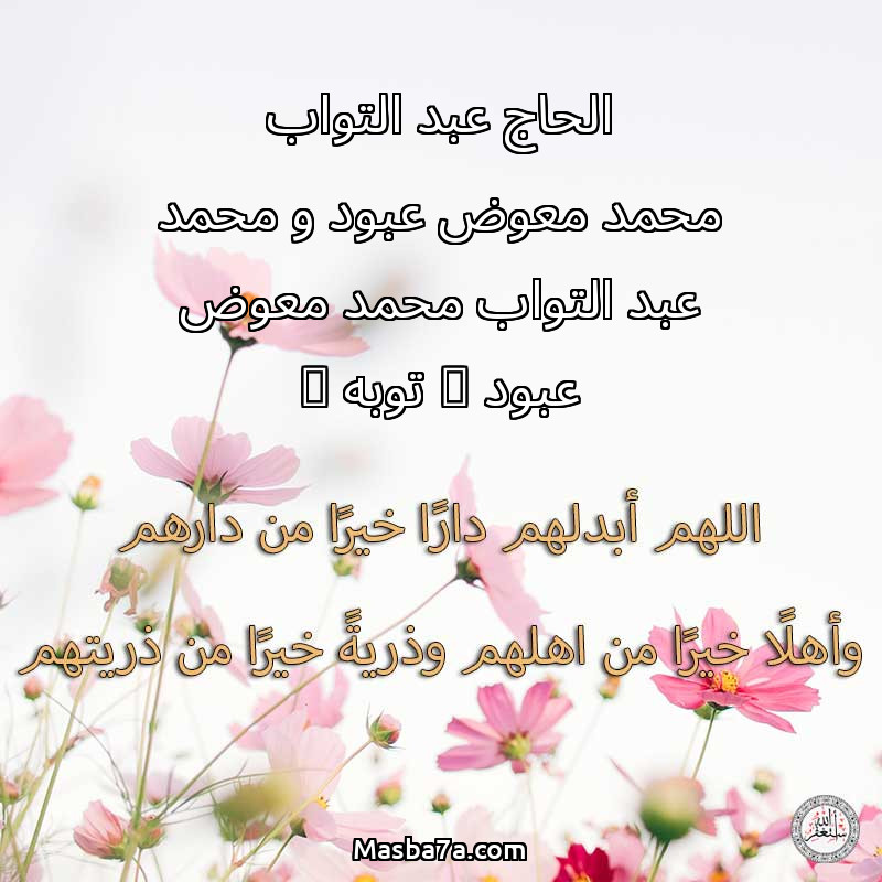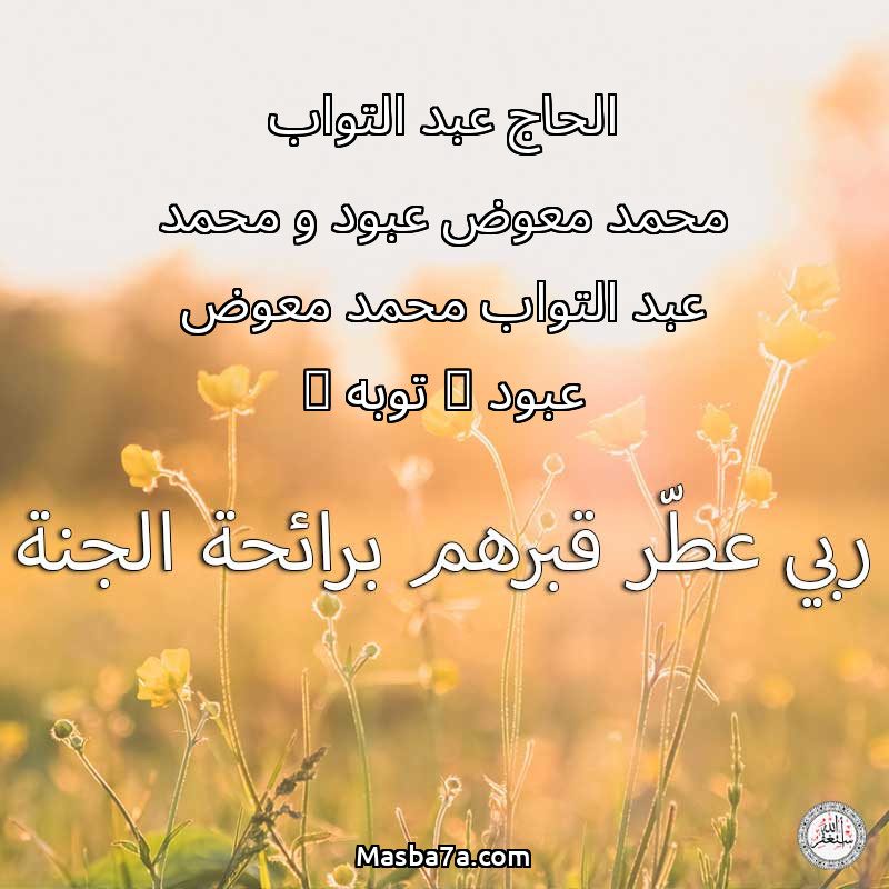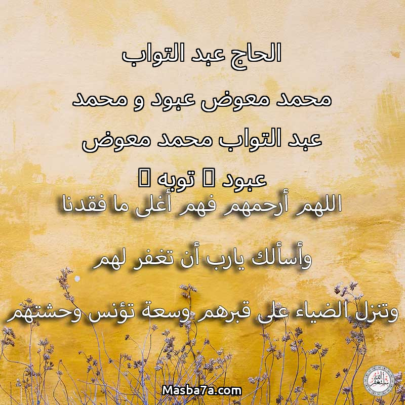 اللهم ارحم ( الحاج عبد التواب محمد معوض عبود و محمد عبد التواب محمد معوض عبود " توبه " ) وانس وحشتهم واجمعنا بهم في جنتك ، اللهم ارحمهم بقدر شوقنا لهم اللهم ارحمهم واغفر لهم.