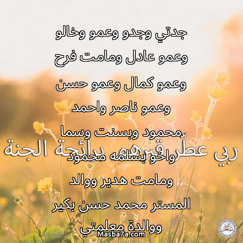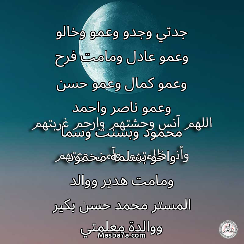 دعاء عن أرواح المرحومين جدتي وجدو وعمو وخالو وعمو عادل ومامت فرح وعمو كمال وعمو حسن وعمو ناصر واحمد محمود وبسنت وسما واخو بسلمه محمود ومامت هدير ووالد المستر محمد حسن بكير ووالدة معلمتي والطالب محمد وجد اروى حماد وجميع موتى المسلمين