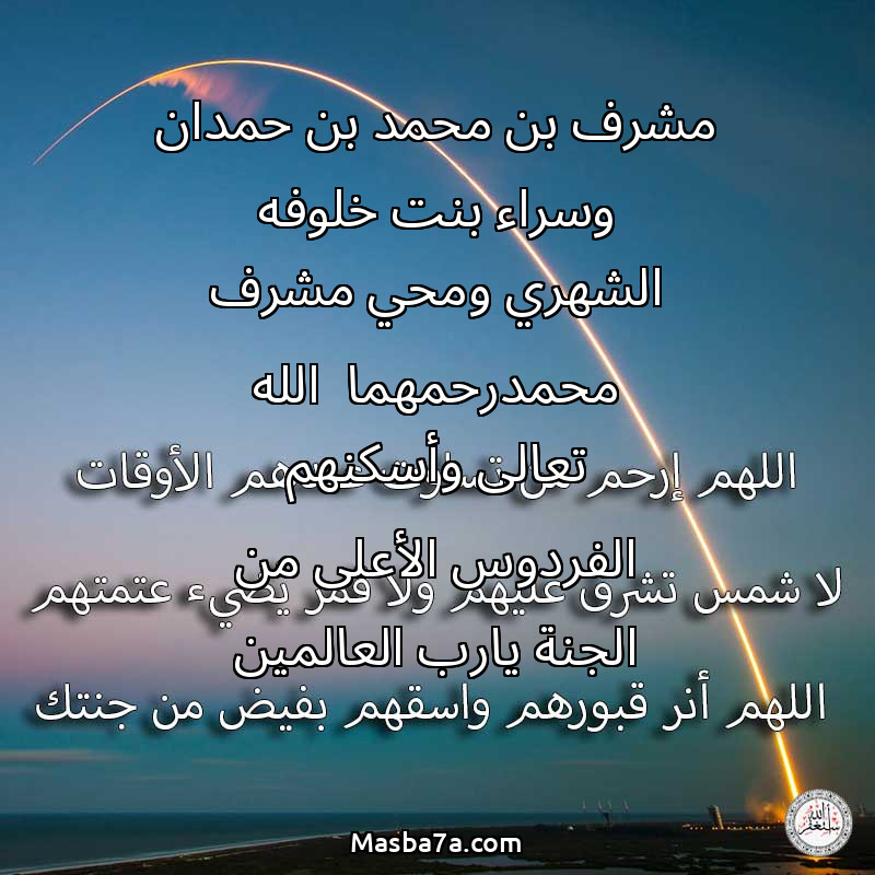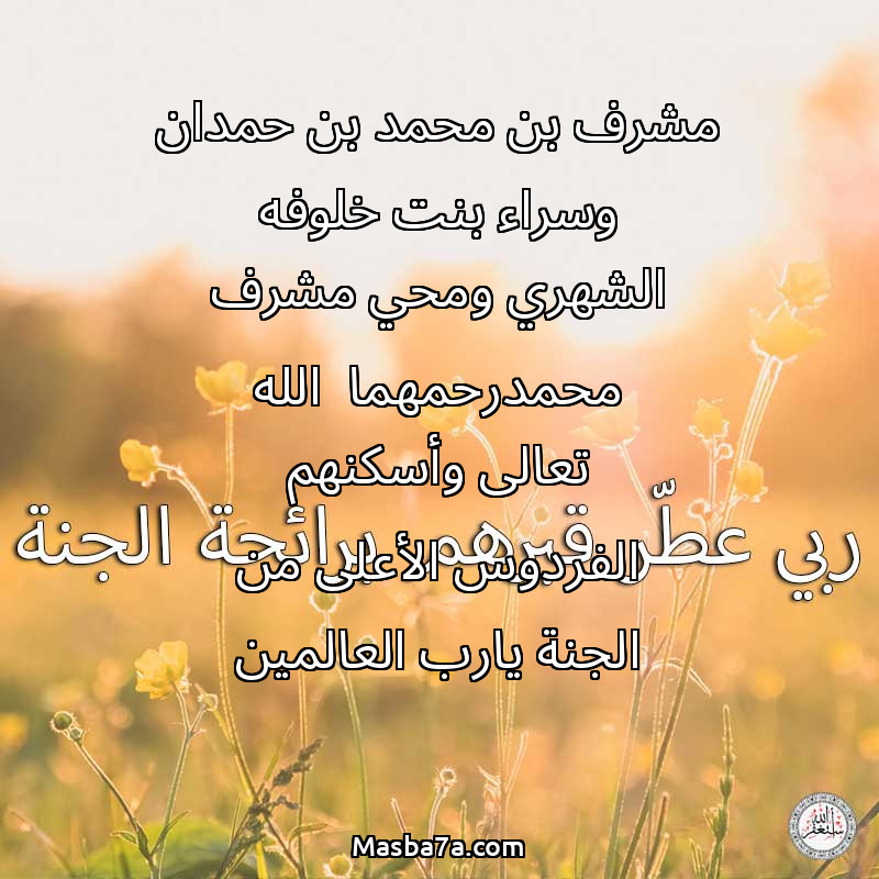دعاء عن أرواح المرحومين مشرف بن محمد بن حمدان وسراء بنت خلوفه الشهري ومحي مشرف محمدرحمهما الله تعالى وأسكنهم الفردوس الأعلى من الجنة يارب العالمين