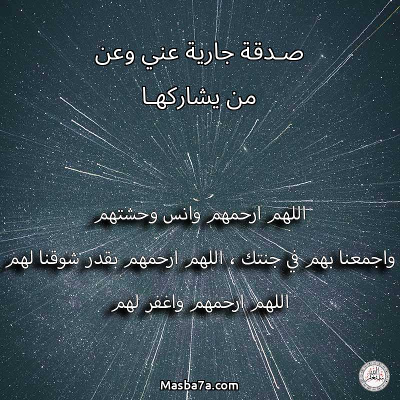 اللهم ارحم ( صـدقة جارية عني وعن من يشاركهـا ) وانس وحشتهم واجمعنا بهم في جنتك ، اللهم ارحمهم بقدر شوقنا لهم اللهم ارحمهم واغفر لهم.