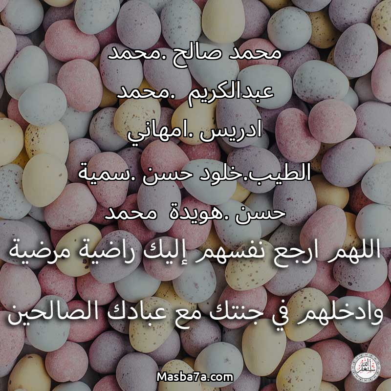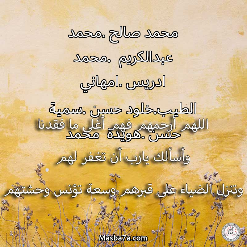 اللهم ارحم ( محمد صالح .محمد عبدالكريم .محمد ادريس .امهاني الطيب.خلود حسن .سمية حسن .هويدة محمد ) وانس وحشتهم واجمعنا بهم في جنتك ، اللهم ارحمهم بقدر شوقنا لهم اللهم ارحمهم واغفر لهم.