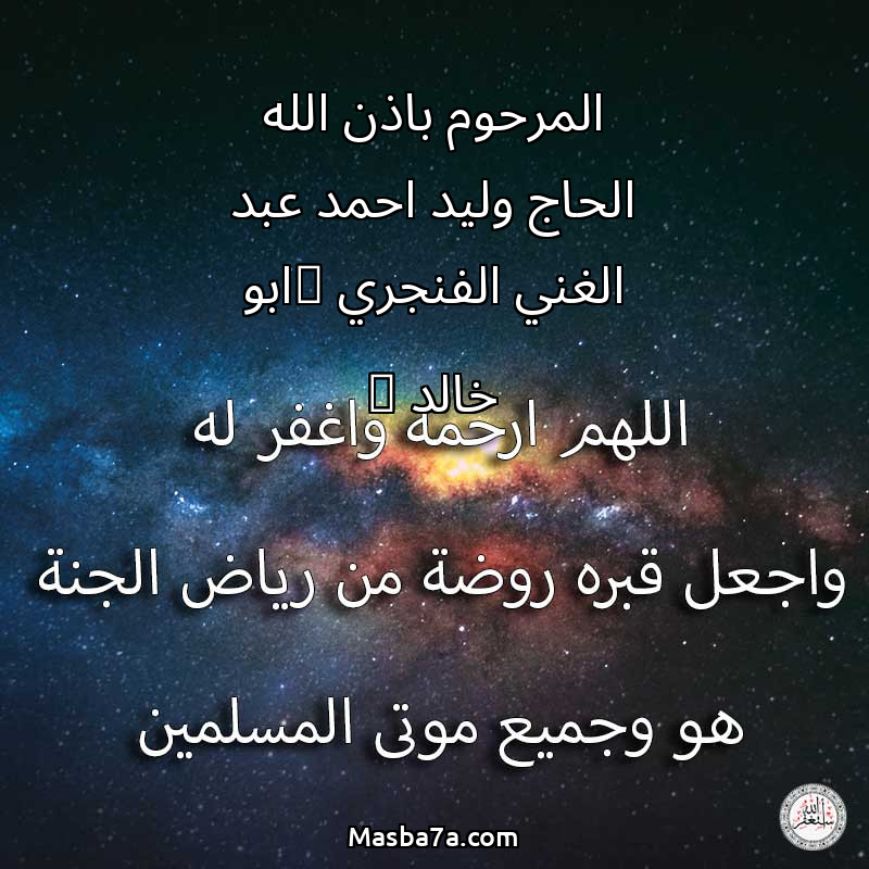 اللهم ارحم ( المرحوم باذن الله الحاج وليد احمد عبد الغني الفنجري (ابو خالد ) ) وانس وحشته واجمعنا به في جنتك ، اللهم ارحمه بقدر شوقنا له اللهم ارحمه واغفر له .