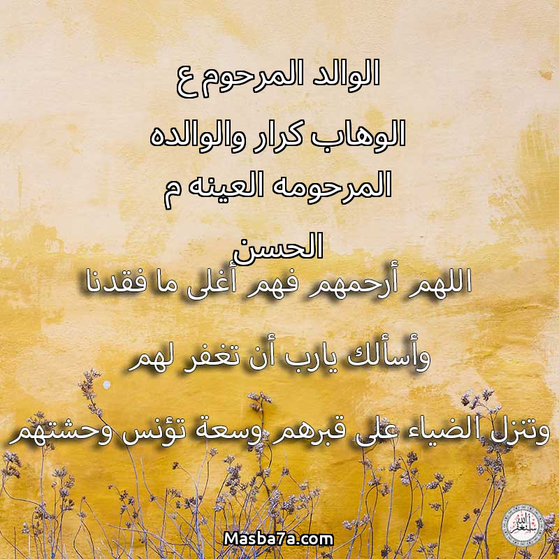 اللهم ارحم ( الوالد المرحوم ع الوهاب كرار والوالده المرحومه العينه م الحسن ) وانس وحشتهم واجمعنا بهم في جنتك ، اللهم ارحمهم بقدر شوقنا لهم اللهم ارحمهم واغفر لهم.