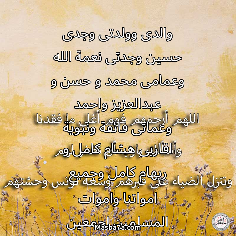 دعاء عن أرواح المرحومين والدى وولدتى وجدى حسين وجدتى نعمة الله وعمامى محمد و حسن و عبدالعزيز واحمد وعماتى فائقة ونبوية اقاربى هشام كامل و ريهام كامل وجميع امواتنا واموات المسلمين اجمعين