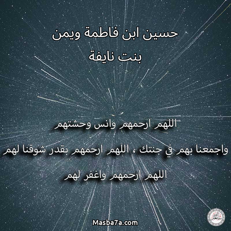اللهم ارحم ( حسين ابن فاطمة ويمن بنت نايفة ) وانس وحشتهم واجمعنا بهم في جنتك ، اللهم ارحمهم بقدر شوقنا لهم اللهم ارحمهم واغفر لهم.