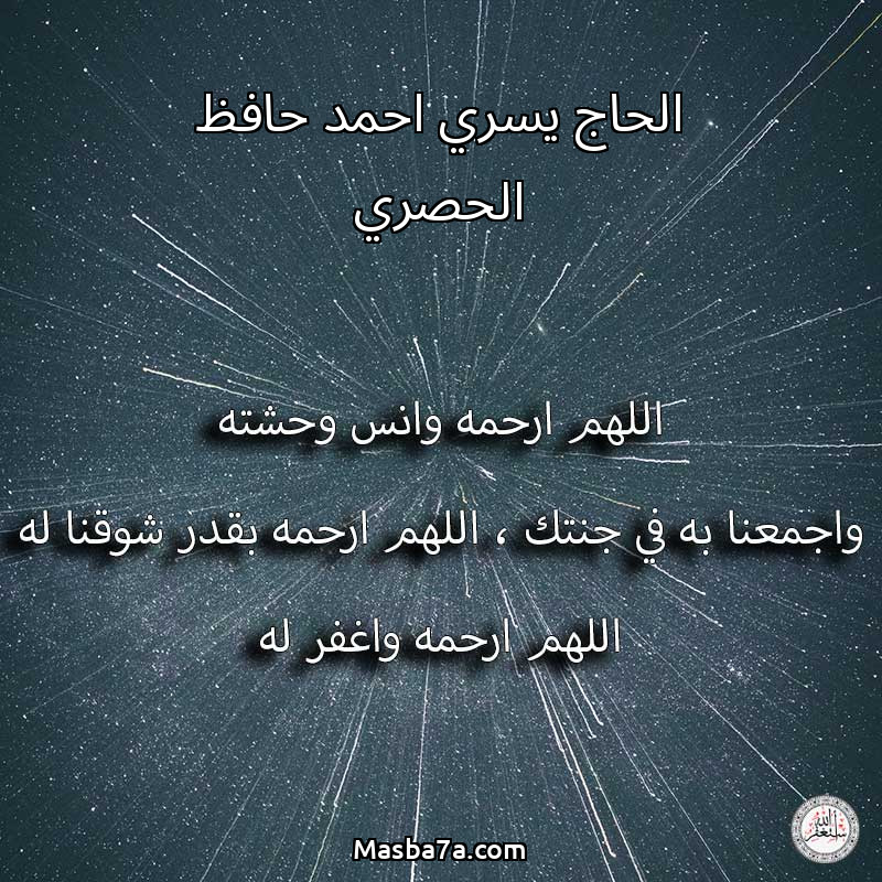 اللهم ارحم ( الحاج يسري احمد حافظ الحصري ) وانس وحشته واجمعنا به في جنتك ، اللهم ارحمه بقدر شوقنا له اللهم ارحمه واغفر له .