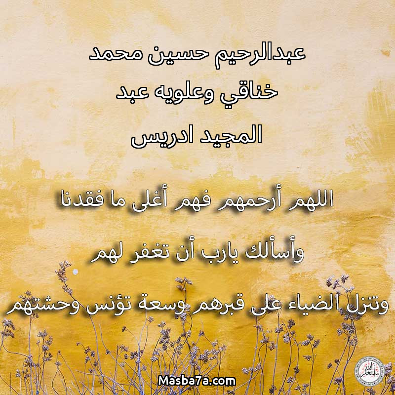اللهم ارحم ( عبدالرحيم حسين محمد خناقي وعلويه عبد المجيد ادريس ) وانس وحشتهم واجمعنا بهم في جنتك ، اللهم ارحمهم بقدر شوقنا لهم اللهم ارحمهم واغفر لهم.