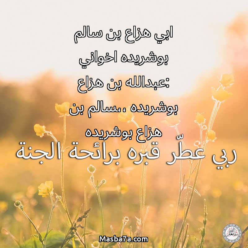 اللهم ارحم ( ابي هزاع بن سالم بوشريده اخواني :عبدالله بن هزاع بوشريده ،،سالم بن هزاع بوشريده ) وانس وحشته واجمعنا به في جنتك ، اللهم ارحمه بقدر شوقنا له اللهم ارحمه واغفر له .