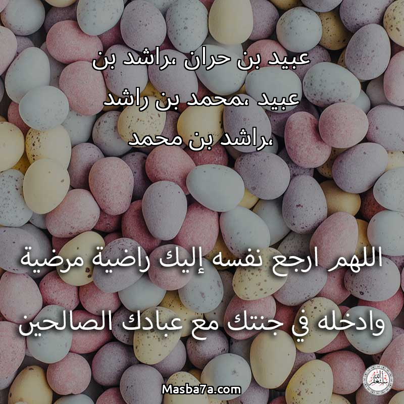اللهم ارحم ( عبيد بن حران ،راشد بن عبيد ،محمد بن راشد ،راشد بن محمد ) وانس وحشته واجمعنا به في جنتك ، اللهم ارحمه بقدر شوقنا له اللهم ارحمه واغفر له .