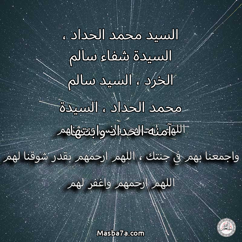 اللهم ارحم ( السيد محمد الحداد ، السيدة شفاء سالم الخرد ، السيد سالم محمد الحداد ، السيدة آمنه الحداد وابنتها ) وانس وحشتهم واجمعنا بهم في جنتك ، اللهم ارحمهم بقدر شوقنا لهم اللهم ارحمهم واغفر لهم.