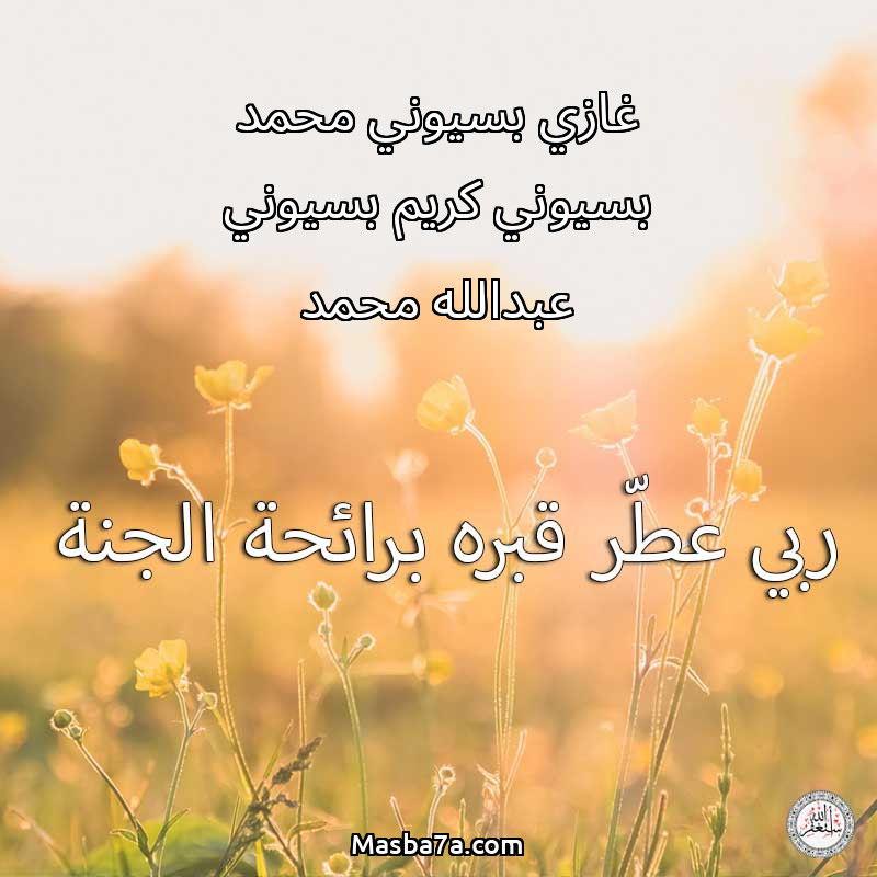 اللهم ارحم ( غازي بسيوني محمد بسيوني كريم بسيوني عبدالله محمد ) وانس وحشته واجمعنا به في جنتك ، اللهم ارحمه بقدر شوقنا له اللهم ارحمه واغفر له .
