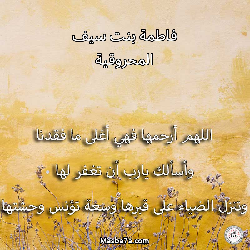 اللهم ارحم ( فاطمة بنت سيف المحروقية ) وانس وحشتها واجمعنا بها في جنتك ، اللهم ارحمها بقدر شوقنا لها اللهم ارحمها واغفر لها .