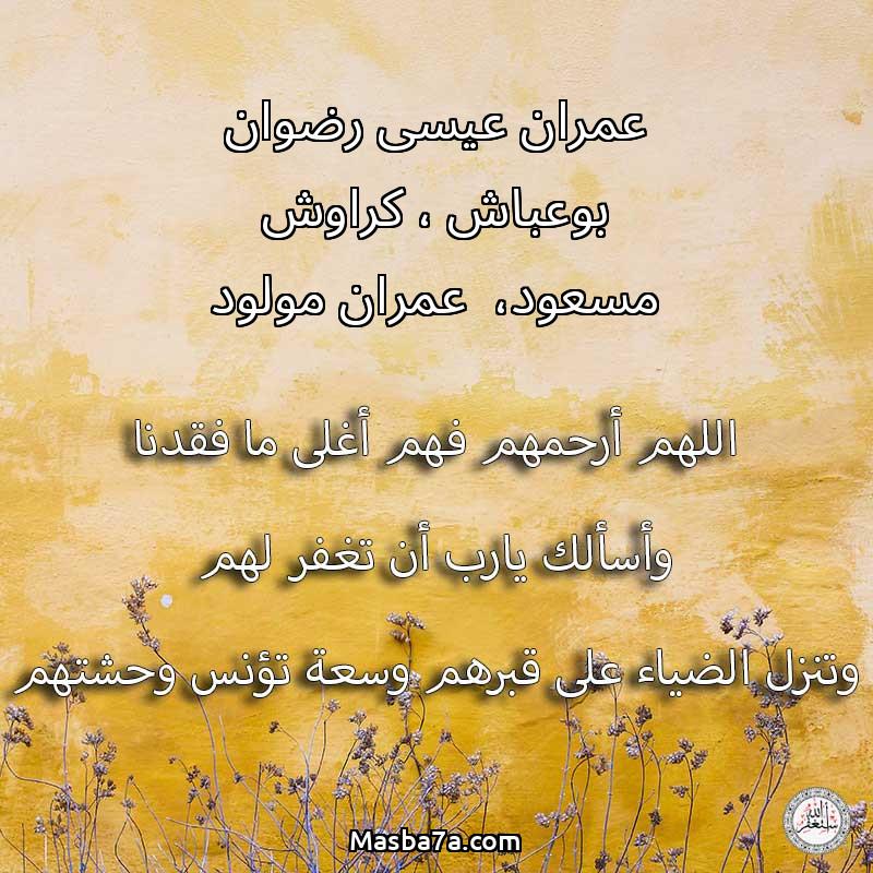 اللهم ارحم ( عمران عيسى رضوان بوعباش ، كراوش مسعود، عمران مولود ) وانس وحشتهم واجمعنا بهم في جنتك ، اللهم ارحمهم بقدر شوقنا لهم اللهم ارحمهم واغفر لهم.