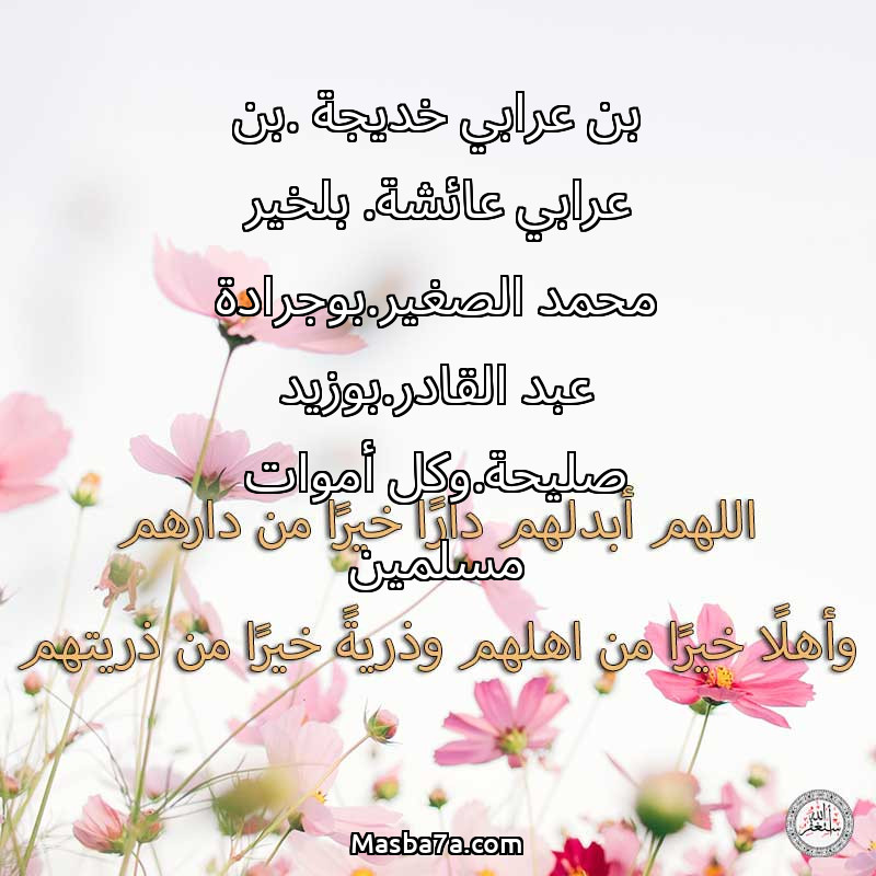 دعاء عن أرواح المرحومين بن عرابي خديجة .بن عرابي عائشة. بلخير محمد الصغير.بوجرادة عبد القادر.بوزيد صليحة.وكل أموات مسلمين