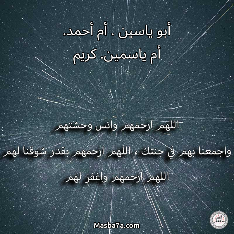 اللهم ارحم ( أبو ياسين . أم أحمد. أم ياسمين. كريم ) وانس وحشتهم واجمعنا بهم في جنتك ، اللهم ارحمهم بقدر شوقنا لهم اللهم ارحمهم واغفر لهم.