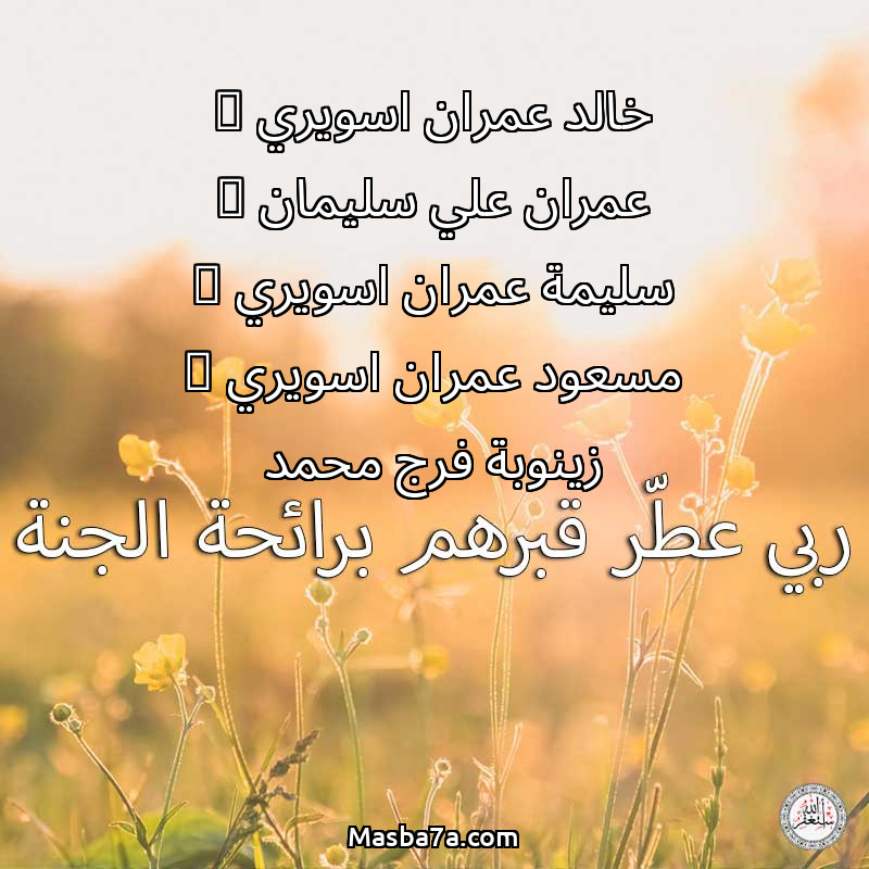 اللهم ارحم ( خالد عمران اسويري _ عمران علي سليمان _ سليمة عمران اسويري _ مسعود عمران اسويري _ زينوبة فرج محمد ) وانس وحشتهم واجمعنا بهم في جنتك ، اللهم ارحمهم بقدر شوقنا لهم اللهم ارحمهم واغفر لهم.