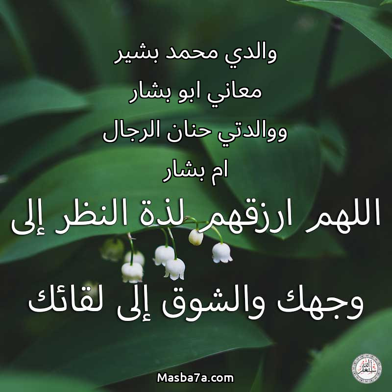 اللهم ارحم ( والدي محمد بشير معاني ابو بشار ووالدتي حنان الرجال ام بشار ) وانس وحشتهم واجمعنا بهم في جنتك ، اللهم ارحمهم بقدر شوقنا لهم اللهم ارحمهم واغفر لهم.