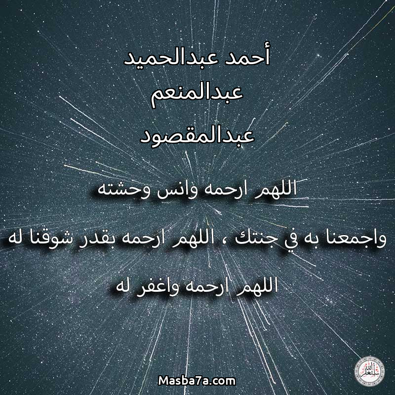 اللهم ارحم ( أحمد عبدالحميد عبدالمنعم عبدالمقصود ) وانس وحشته واجمعنا به في جنتك ، اللهم ارحمه بقدر شوقنا له اللهم ارحمه واغفر له .
