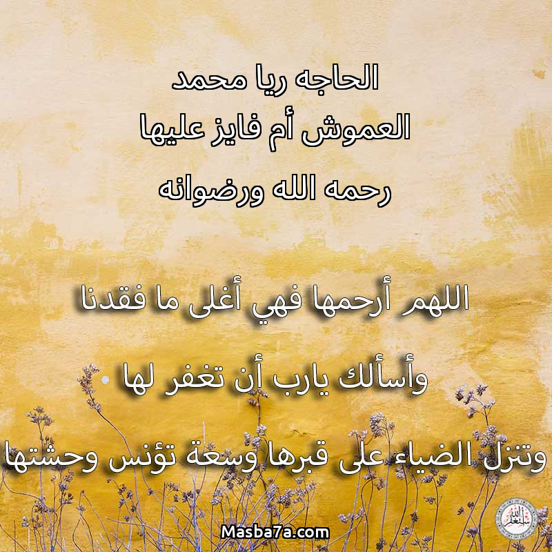 اللهم ارحم ( الحاجه ريا محمد العموش أم فايز عليها رحمه الله ورضوانه ) وانس وحشتها واجمعنا بها في جنتك ، اللهم ارحمها بقدر شوقنا لها اللهم ارحمها واغفر لها .