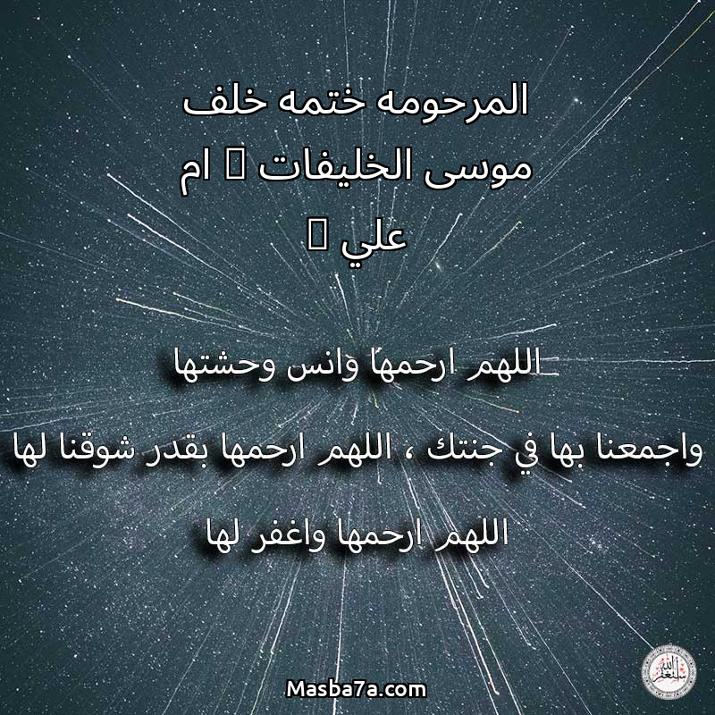 اللهم ارحم ( المرحومه ختمه خلف موسى الخليفات ( ام علي ) ) وانس وحشتها واجمعنا بها في جنتك ، اللهم ارحمها بقدر شوقنا لها اللهم ارحمها واغفر لها .