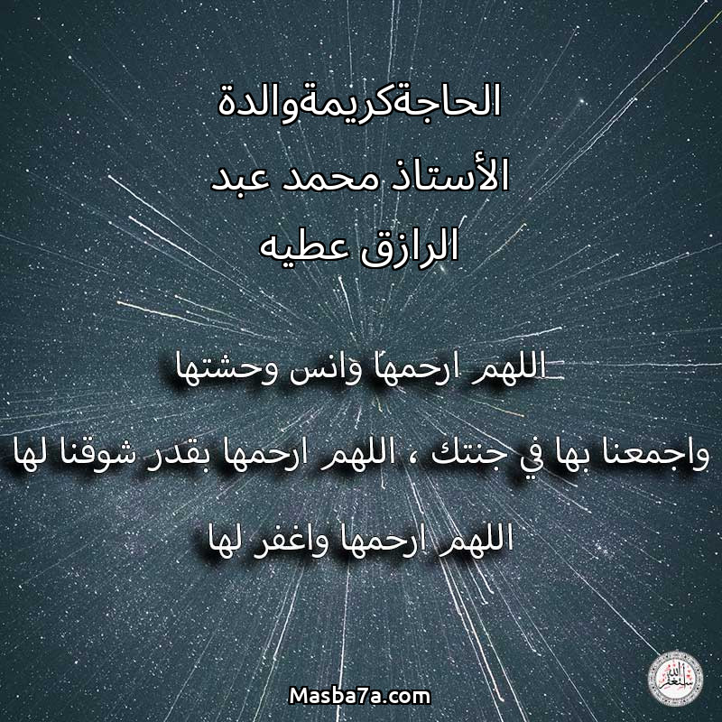 اللهم ارحم ( الحاجةكريمةوالدة الأستاذ محمد عبد الرازق عطيه ) وانس وحشتها واجمعنا بها في جنتك ، اللهم ارحمها بقدر شوقنا لها اللهم ارحمها واغفر لها .