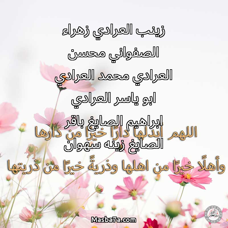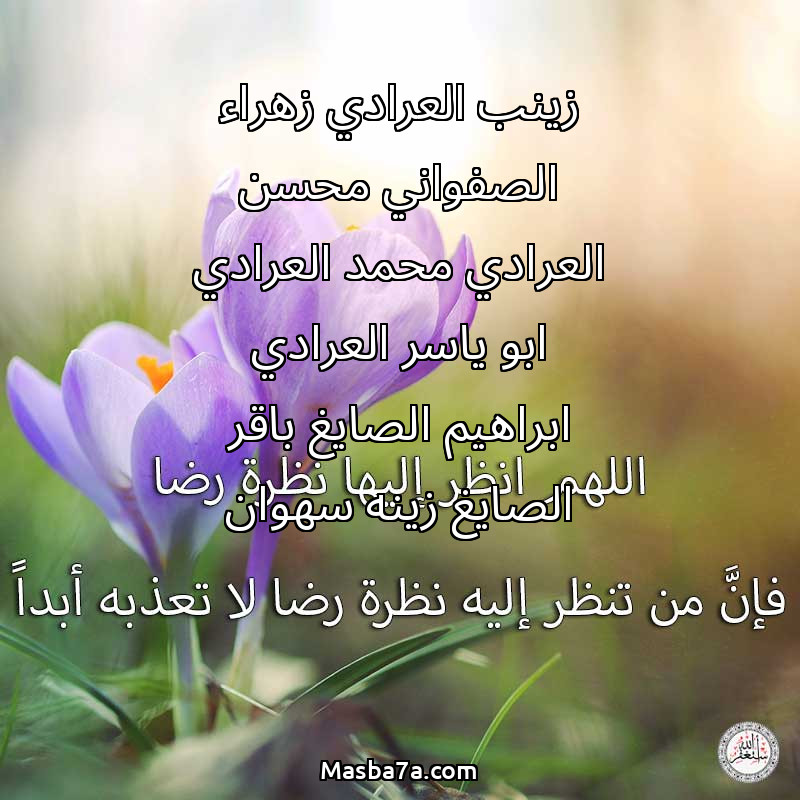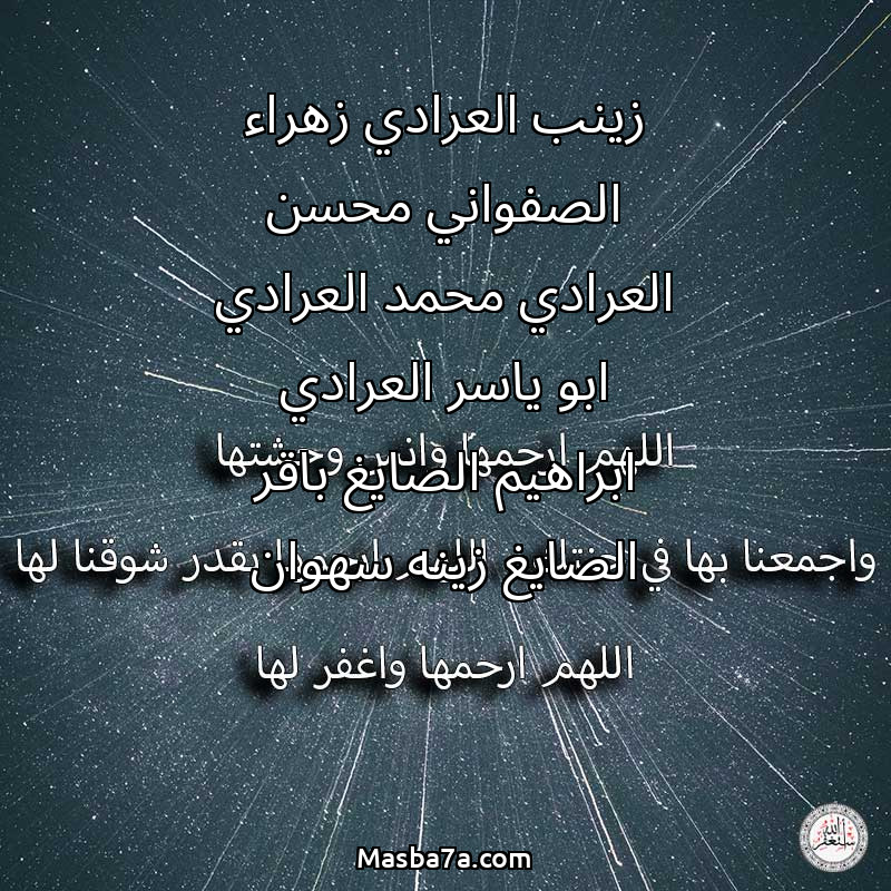 دعاء عن روح المرحومة زينب العرادي زهراء الصفواني محسن العرادي محمد العرادي ابو ياسر العرادي ابراهيم الصايغ باقر الصايغ زينه سهوان
