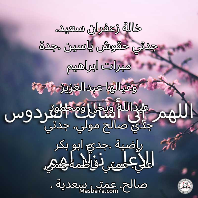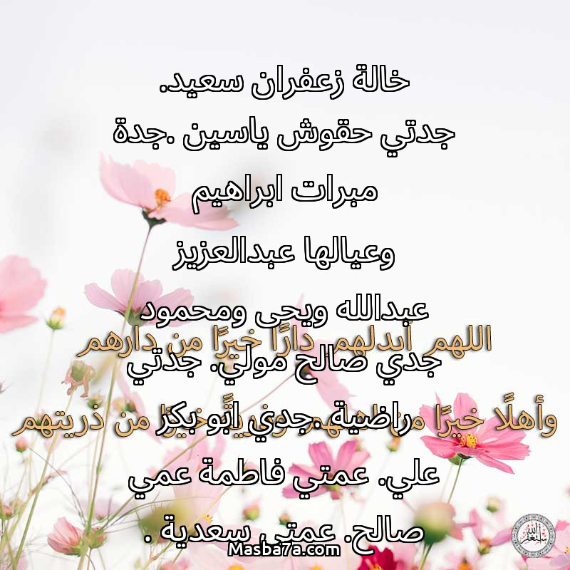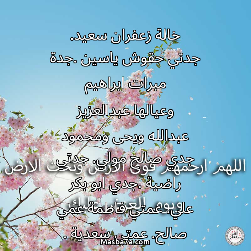 دعاء عن أرواح المرحومين خالة زعفران سعيد. جدتي حقوش ياسين .جدة مبرات ابراهيم وعيالها عبدالعزيز عبدالله ويحى ومحمود جدي صالح مولي. جدتي راضية .جدي ابو بكر علي. عمتي فاطمة عمي صالح. عمتي سعدية . جواهر . آلاء فلاتة ابو شيماء عبدالرحمن . عم دمنه . عم عبدالحميد ناجي .عبده فتوي