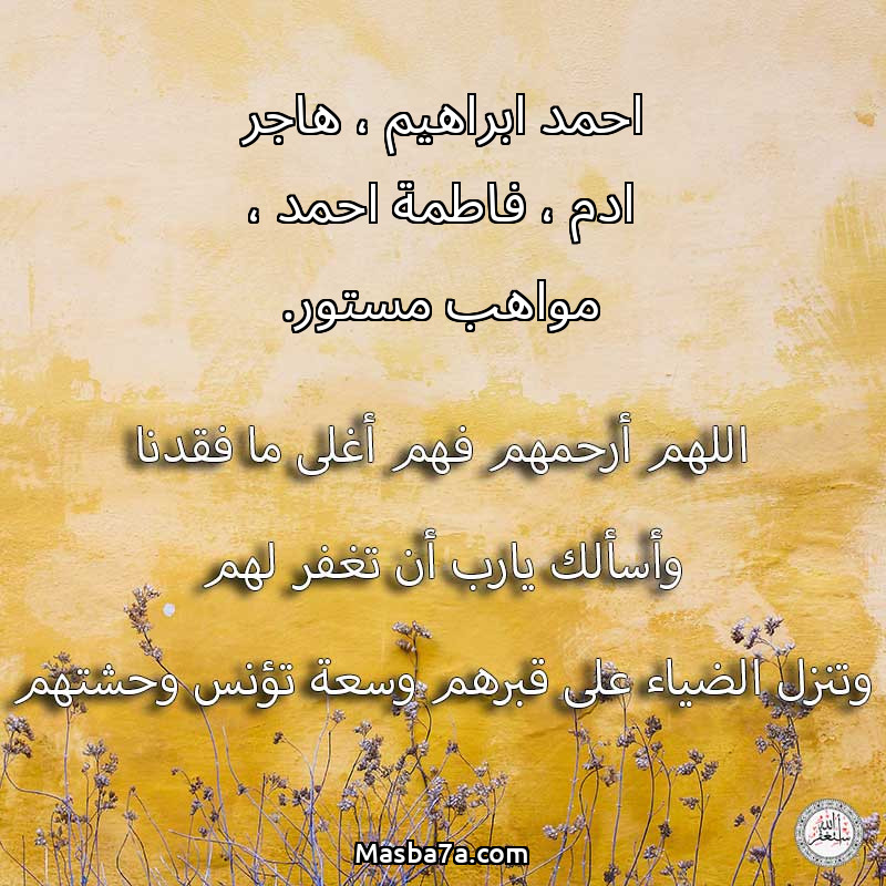 اللهم ارحم ( احمد ابراهيم ، هاجر ادم ، فاطمة احمد ، مواهب مستور. ) وانس وحشتهم واجمعنا بهم في جنتك ، اللهم ارحمهم بقدر شوقنا لهم اللهم ارحمهم واغفر لهم.