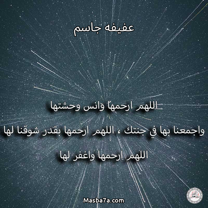 اللهم ارحم ( عفيفه جاسم ) وانس وحشتها واجمعنا بها في جنتك ، اللهم ارحمها بقدر شوقنا لها اللهم ارحمها واغفر لها .