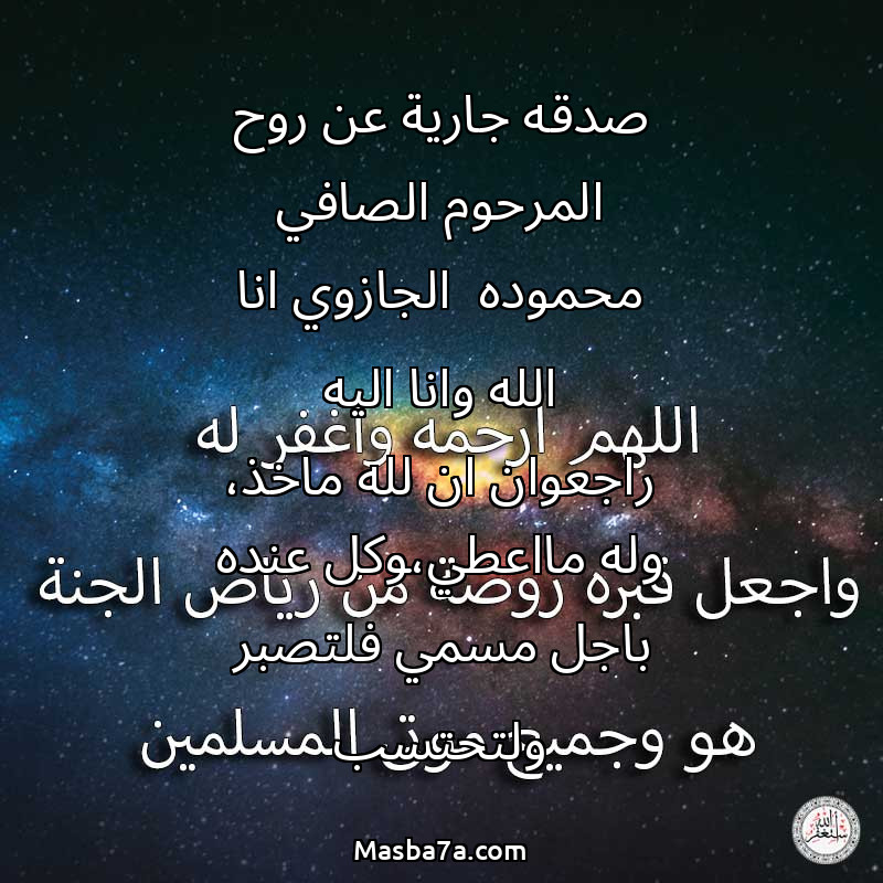 دعاء عن روح المرحوم صدقه جارية عن روح المرحوم الصافي محموده الجازوي انا الله وانا اليه راجعوان ان لله ماخذ، وله مااعطي،وكل عنده باجل مسمي فلتصبر ولتحتسب