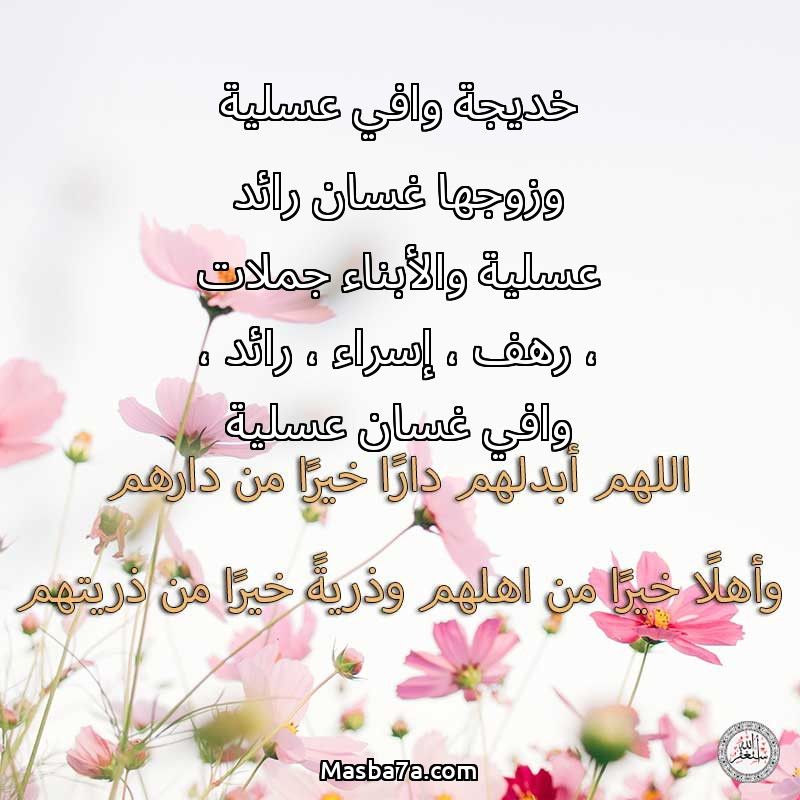 اللهم ارحم ( خديجة وافي عسلية وزوجها غسان رائد عسلية والأبناء جملات ، رهف ، إسراء ، رائد ، وافي غسان عسلية ) وانس وحشتهم واجمعنا بهم في جنتك ، اللهم ارحمهم بقدر شوقنا لهم اللهم ارحمهم واغفر لهم.