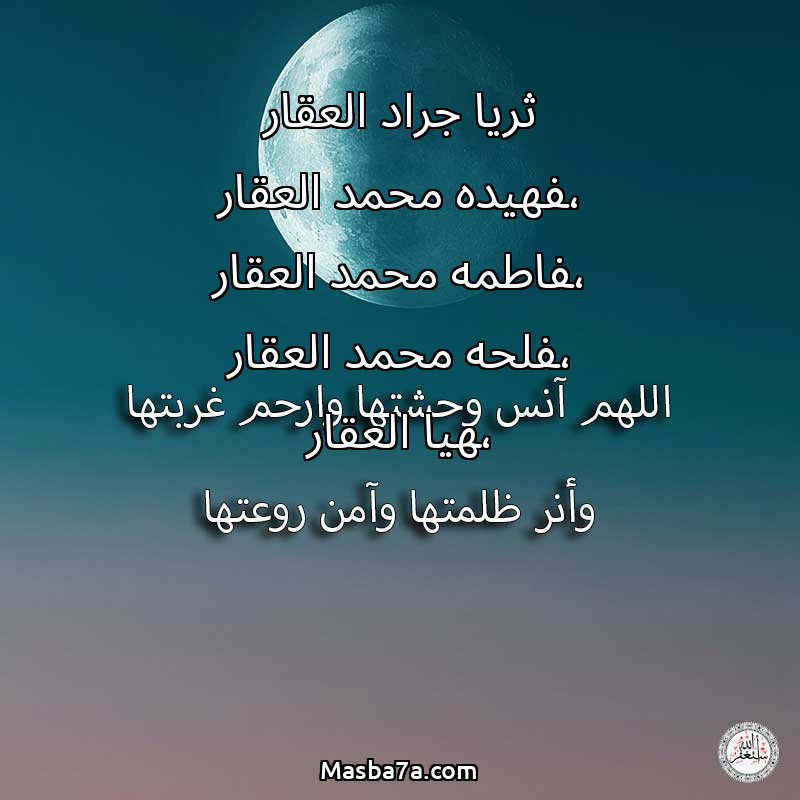 اللهم ارحم ( ثريا جراد العقار ،فهيده محمد العقار ،فاطمه محمد العقار ،فلحه محمد العقار ،هيا العقار ) وانس وحشتها واجمعنا بها في جنتك ، اللهم ارحمها بقدر شوقنا لها اللهم ارحمها واغفر لها .